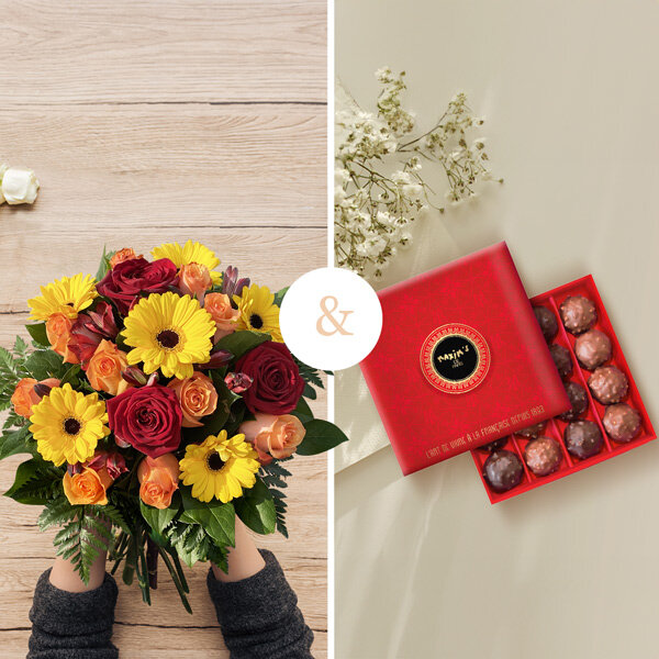 Bouquet rond dans les tons rouge, orange, jaune et vert, composé de petites roses, germinis, fleurettes et feuillages, accompagné de sa boite de 16 rochers pralinés Maxim's au chocolat au lait et chocolat noir (160g).