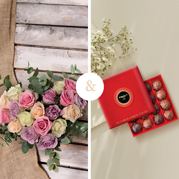 Bouquet de 19 roses pastel avec eucalyptus, disposées en forme de coeur, accompagné de sa boite de 16 rochers pralinés Maxim's au chocolat au lait et chocolat noir (160g).