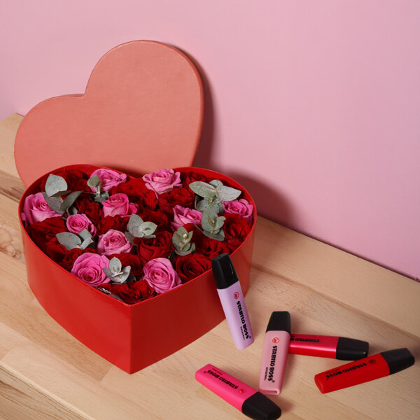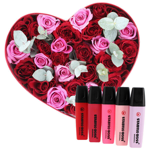 Boîte rouge en forme de cœur contenant 17 roses rouges, 10 roses roses et de l’eucalyptus. Elle comprend également un lot de 5 Stabilo, dont la nouvelle référence : le Stabilo Boss Original rouge.