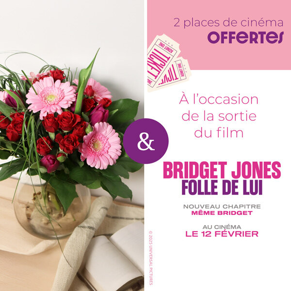 Ce bouquet s'accompagne de 2 places de cinéma offertes, pour le film Bridget Jones Folle de lui.