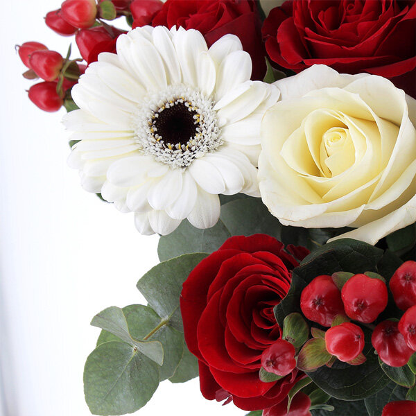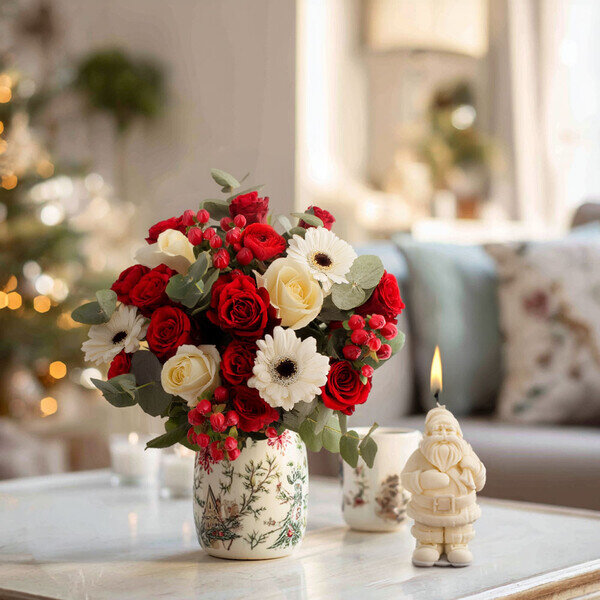 Bouquet de Noël composé de roses rouges et blanches, germinis blancs, renoncules rouges, hypericum et eucalyptus. Le tout accompagné de sa bougie parfumée (81g) en forme de Père Noël, senteur noisette. Bougie cire de soja et parfum de Grasse. Réalisez avec des produits Français et respectueux de l'environnement. Retirez le ruban avant d’allumer la bougie.