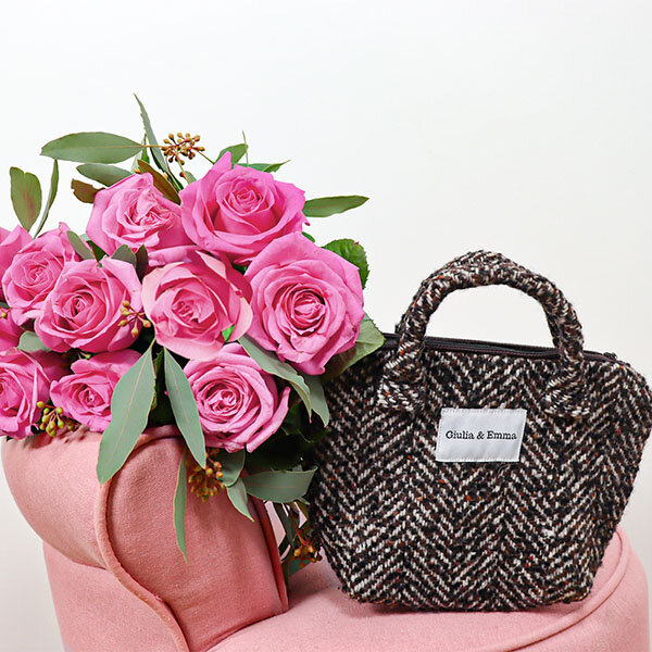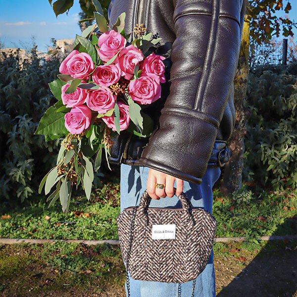 Bouquet composé de 10 roses faella françaises agrémenté d'eucalyptus populus, et d'un sac à main, modèle Mini G&E Tweed Laine chevron marron de la marque Guilia & Emma. Sa matière extérieure est composée de 100 % de Tweed Laine, tandis que l'intérieur est 100 % coton, renforcé par un entoilage rigide. Dimensions : 21 centimètres de largeur / 15 centimètres de hauteur. Entretien, le sac doit être lavé à la machine uniquement.