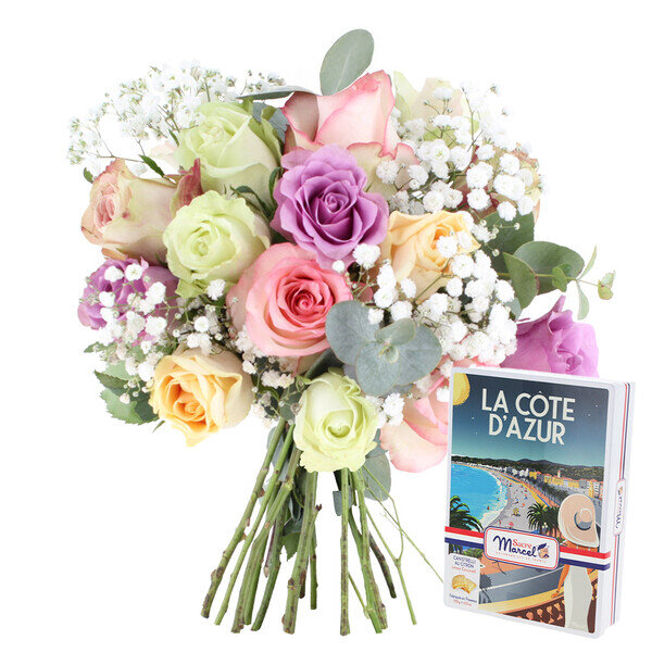 Bouquet de 15 roses pastel, gypsophile et eucalyptus, accompagné de sa boîte en métal à l'effigie de la Côte d'Azur, contenant de délicieux canistrelli au citron.
