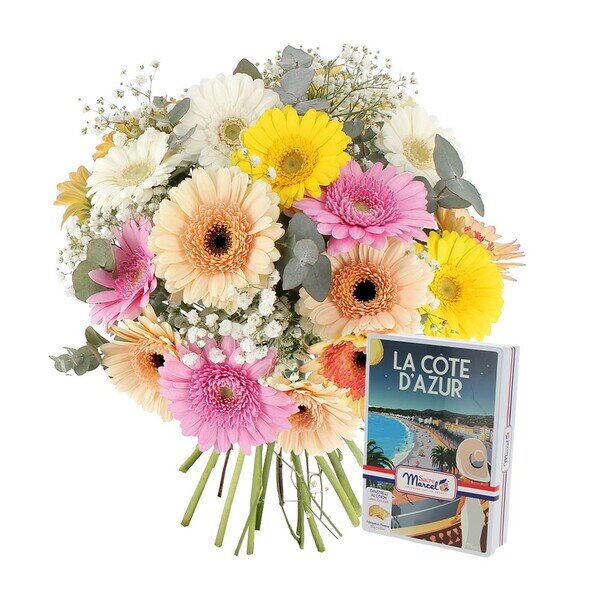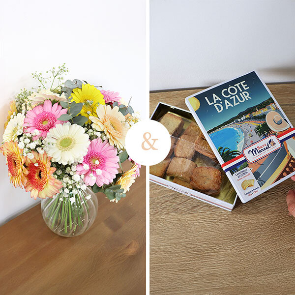Bouquet de germinis dans les tons pastel, de gypsophile et d'eucalyptus, accompagné de sa boîte en métal à l'effigie de la Côte d'Azur, contenant de délicieux canistrelli au citron.