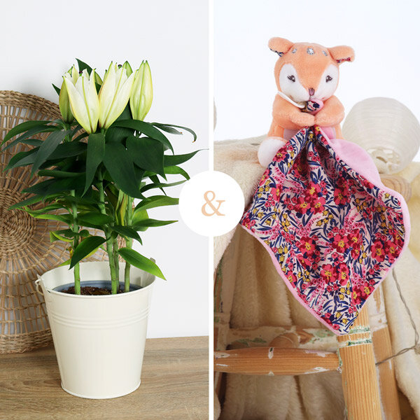 Une naissance à célébrer ? Offrez aux jeunes parents un élégant lys en pot pour apporter fraîcheur et apaisement à leur intérieur. Pour le nouveau-né, un doudou faon rose, spécialement conçu pour éveiller en douceur les sens, présenté dans son écrin assorti, idéal pour conserver les souvenirs précieux de la naissance.