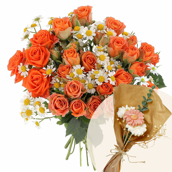 Bouquet dans les tons orange et blanc composé de 5 roses branchues orange et 3 tanacetum, accompagné de son bouquet de 3 bougies marguerites blanches et roses, sur pic en bois. Réalisez avec des produits français et respectueux de l'environnement, cette bougie est mélangée et coulée à la main pour créer une œuvre unique. Les petites imperfections artisanales ajoutent une touche d'authenticité à chaque pièce. Toutes les fleurs du bouquet de bougies sont senteurs monoï Taille de la bougie : 6,5 x 2 Avec tige entre 20 et 25cm Poids de la bougie : 20g