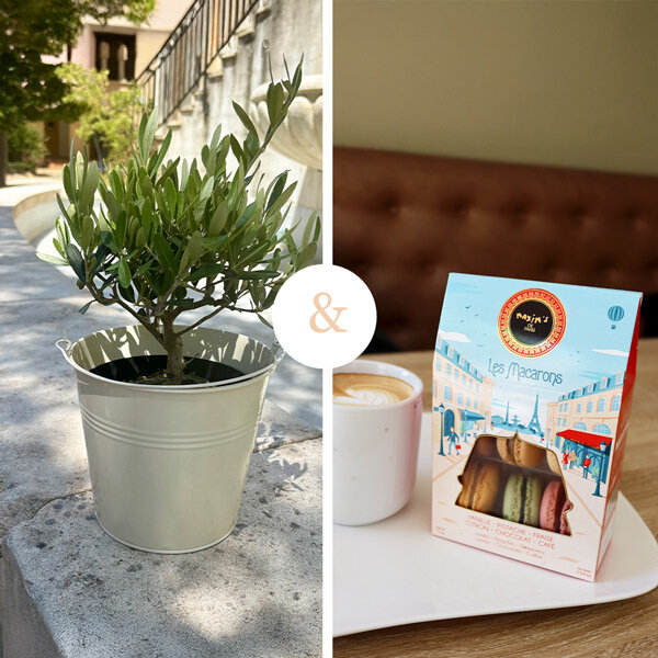 Offrez un cadeau alliant beauté naturelle et gourmandise : un olivier dans son pot en zinc rond, symbole de paix et de longévité. Il est accompagné d’un coffret de 6 macarons de la Maison Maxim’s aux saveurs délicates vanille, pistache, fraise, citron, chocolat et café. Ce duo élégant et raffiné séduira autant les amateurs de plantes que les gourmands. Profitez de notre service de livraison plantes rapide et soignée pour envoyer ce cadeau unique directement à domicile et faire plaisir en toute occasion.