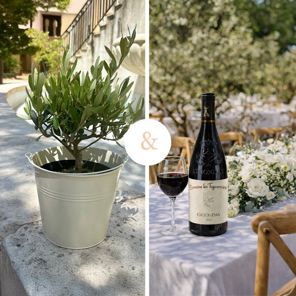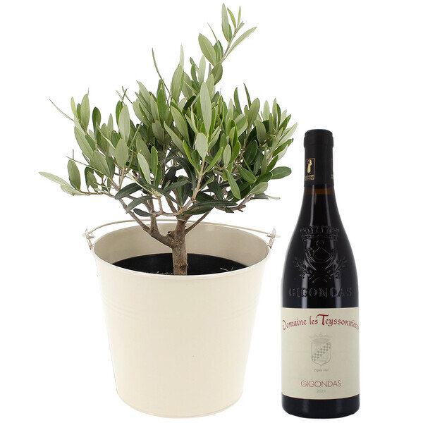 Olivier dans son pot en zinc, blanc cassé ou taupe selon arrivage, accompagné de sa bouteille de vin rouge A.O.P Gigondas 2023 du Domaine Les Teyssonnières. (75cl).