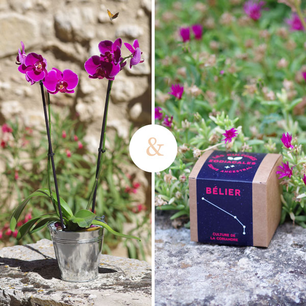 Orchidée Phalaenopsis 2 branches d'une hauteur de 45-50cm dans son pot en zinc (la couleur de l'orchidée varie en fonction de l'arrivage). Accompagné de son Kit de culture zodiacale 'Bélier', contenant une bombe de graines de Coriandre, un comprimé de substrat et un pot de germination biodégradable.