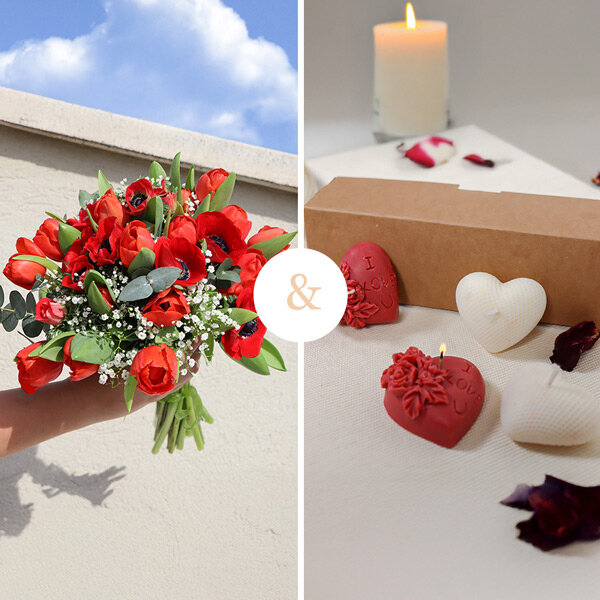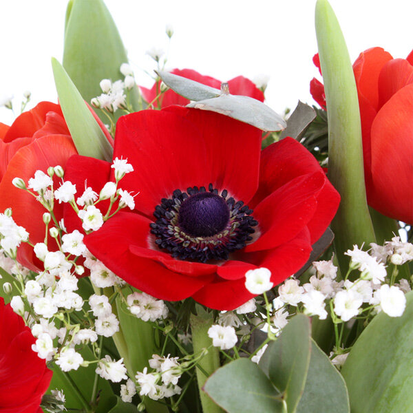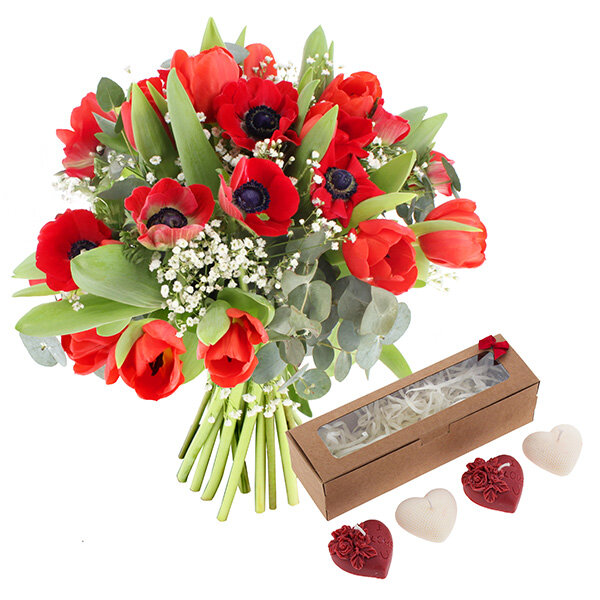 Bouquet dans les tons rouge et vert, composé de 10 tulipes et 10 anémones rouges, agrémenté de gypsophile et d'eucalyptus, le tout accompagné de son lot de 4 petites bougies en forme de cœurs, senteur fruits rouges.