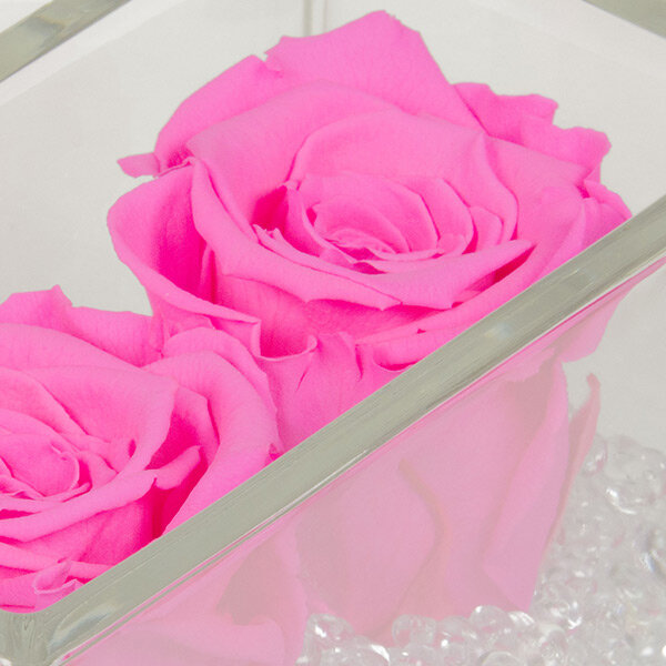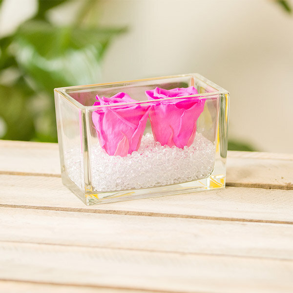 Deux roses éternelles rose avec ses cristaux transparents dans son contenant en verre rectangulaire.