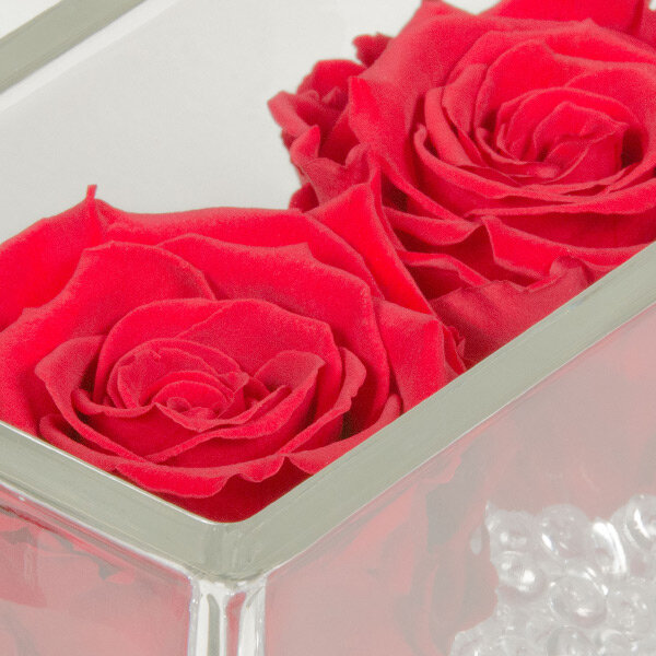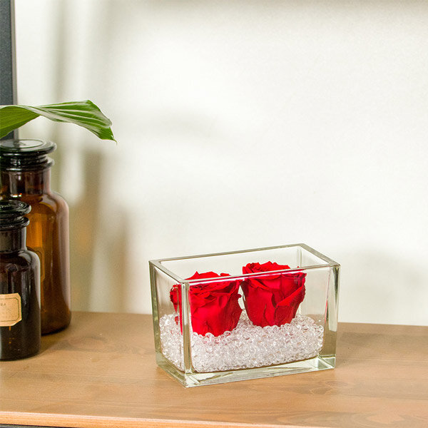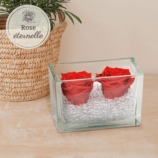 Deux roses éternelles rouge avec ses cristaux transparents dans son contenant en verre rectangulaire.