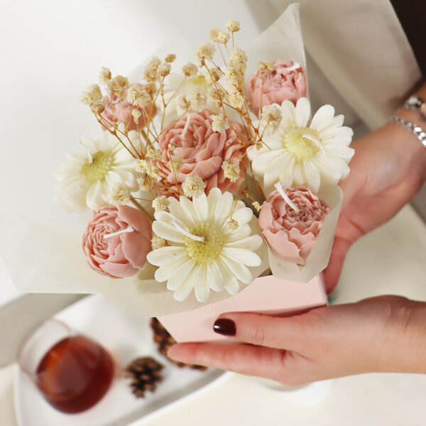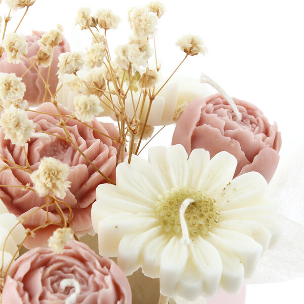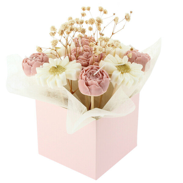 Bouquet de bougies en forme de fleurs. Composé de 4 petites pivoines roses, 1 grande pivoine rose et 4 marguerites blanches. Pour consumer la bougie, nous vous conseillons de la retirer de son pic et de la placer dans un récipient adéquat. Poids du bouquet : environ 230g
