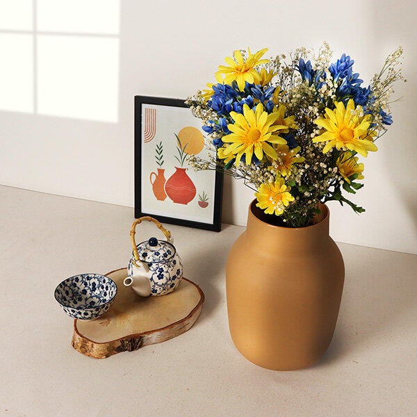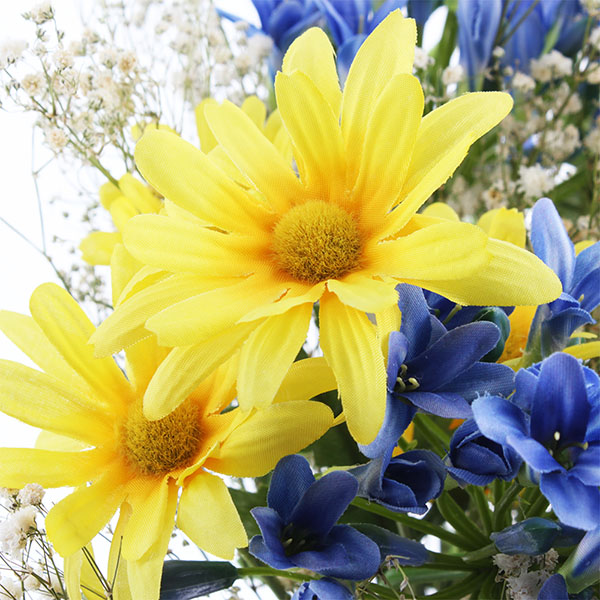 Ce somptueux bouquet en soie associe la noblesse des agapanthes bleues à la luminosité des centaureas jaunes, créant un contraste harmonieux qui évoque les champs de blé sous un ciel d'été. Ces fleurs artificielles de haute qualité ne nécessitent aucun entretien particulier : un simple dépoussiérage délicat suffit pour conserver leur éclat. Le bleu symbolise la sérénité, tandis que le jaune représente la joie et l'amitié. Placez ce bouquet dans votre salon près d'une source de lumière naturelle pour sublimer ses couleurs, ou dans une entrée pour accueillir vos invités avec élégance. Sa durabilité en fait un investissement décoratif idéal pour transformer durablement votre intérieur. L'alliance parfaite entre sophistication et praticité pour ceux qui aiment recevoir sans contrainte. Découvrez également notre large gamme de bouquets de fleurs séchées pour sublimer chaque moment de votre vie.