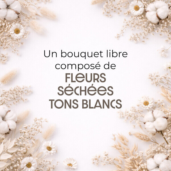 Votre artisan fleuriste réalisera une création de fleurs séchées dans les tons blancs en fonction de la touche artistique qui lui est propre et de la tendance du moment. Le visuel présenté est non contractuel.