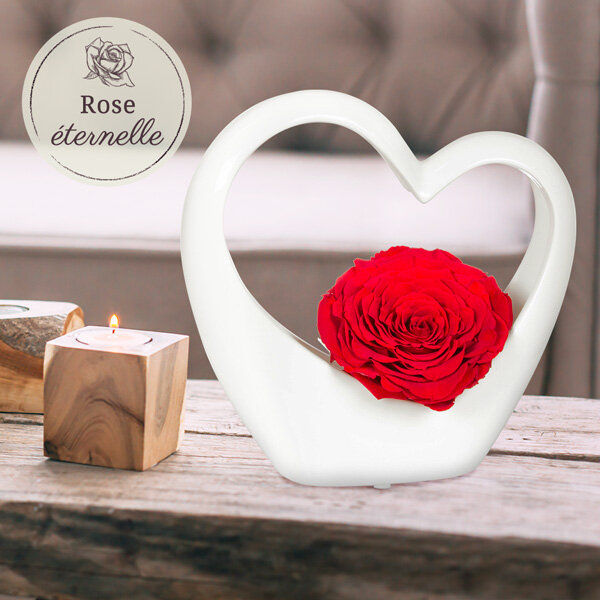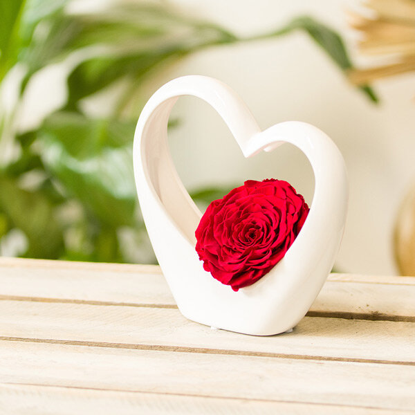 Rose stabilisée rouge (10cm de diamètre) dans son mini cœur en céramique blanc.