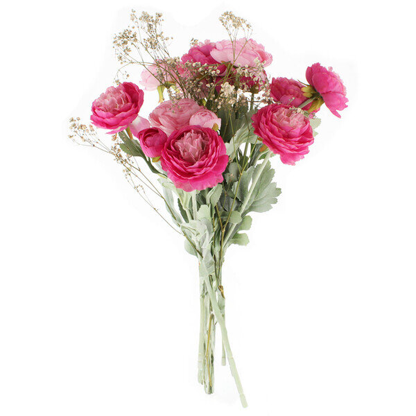 Le bouquet Ballet séduit par l’élégance de ses renoncules artificielles aux pétales soyeux, déclinées dans des nuances raffinées de fuchsia et de rose poudré. Subtilement rehaussé de gypsophile séché, il évoque la délicatesse d’un arrangement floral romantique et intemporel.