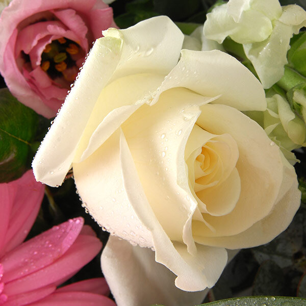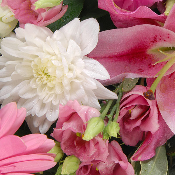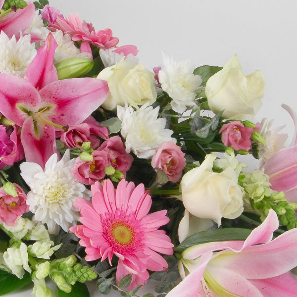 Gerbe piquée dans les tons blanc et rose composée de lys, roses, œillets et autre fleurs de saison le tout accompagné de feuillage.