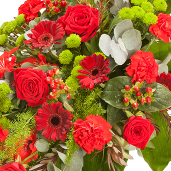 Gerbe main dans les tons rouge et vert composée de glaieuls, roses, hypericum, germinis, œillets, santinis verts, leucodendron, salal, asparagus, aspidistra et eucalyptus.