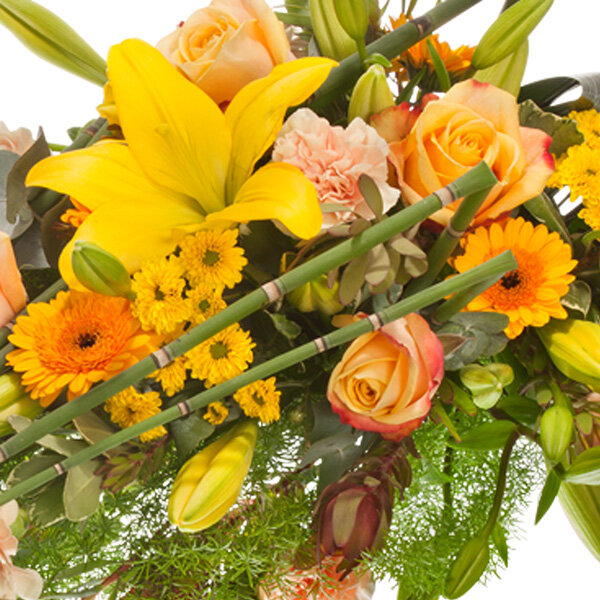 Splendide gerbe aux couleurs éclatantes. Nos artisans fleuristes ont atténué le rayonnement des fleurs jaunes par de petites touches rose pâle pour un rendu définitivement riche. Pour un deuil, cette belle gerbe exprimera parfaitement la force de votre amitié.