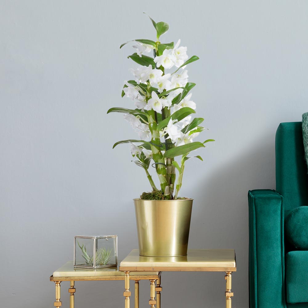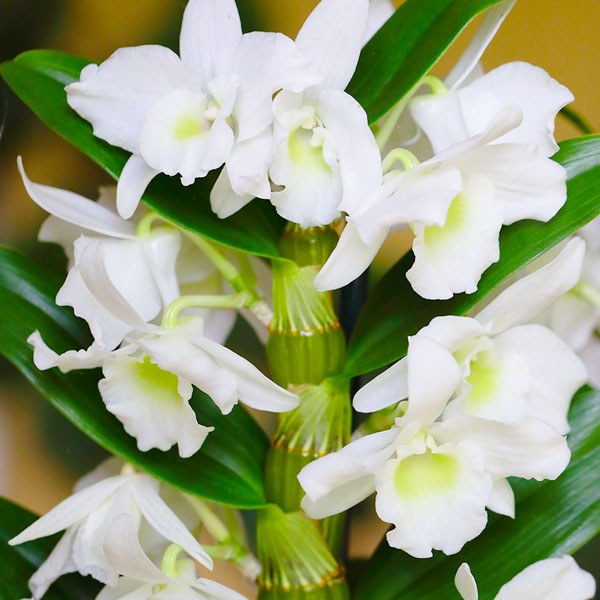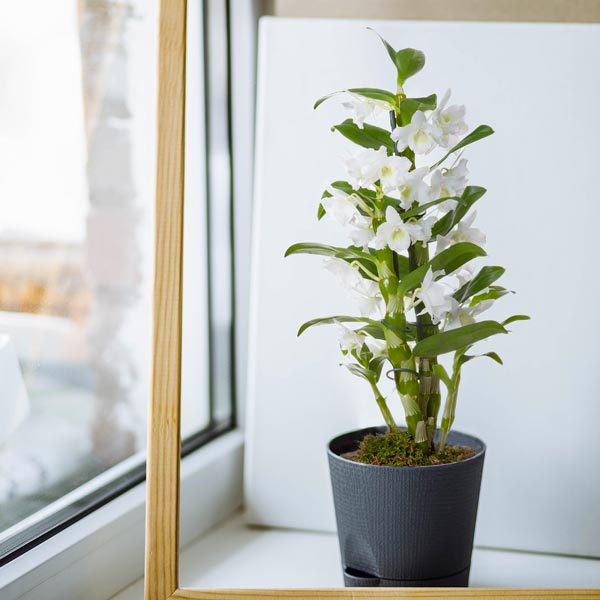Le dendrobium ou orchidée bambou n'est décoratif qu'en hiver et en pleines fleurs. Votre précieux dendrobium a besoin de lumière et de températures assez hautes sans être desséchantes, un rebord de fenêtre lui conviendra en évitant le soleil brûlant de midi. Arrosez modérément de manière à ce que le mélange sèche bien en surface mais ne soit pas desséché à l'intérieur et respirez l'odeur enivrante de ses fleurettes.