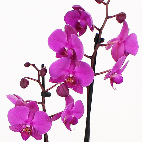 Avec ses fleurs qui semblent flotter dans les airs, l’orchidée violette telle la pourpre antique, couleur des empereurs romains, symbolise l’admiration et le respect. Ce beau phalaenopsis dans son élégant cache-pot apportera une aura d’exotisme dans la pièce qui l’accueillera.