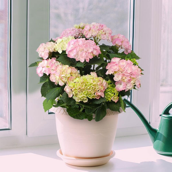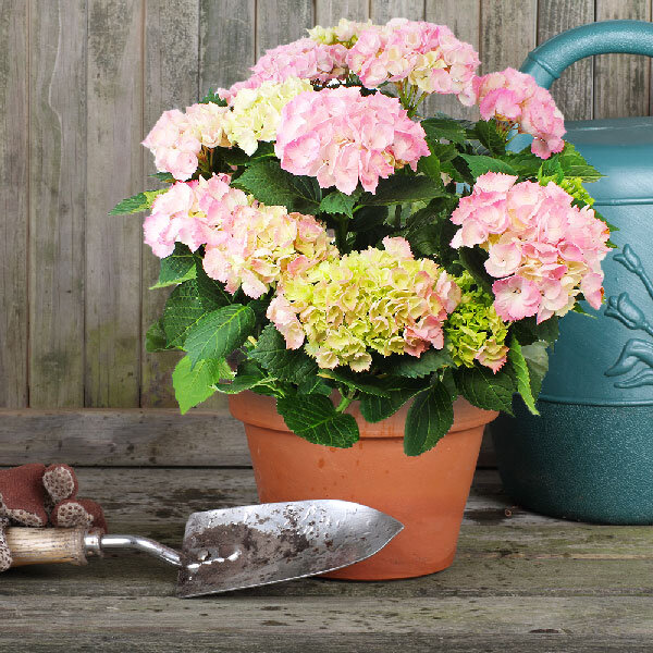 Hortensia rose pâle en pot (le nombre et la taille des têtes d'hortensia peuvent varier).