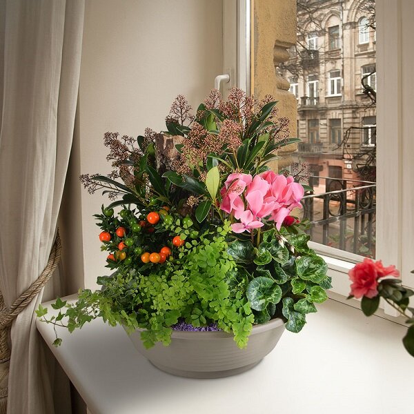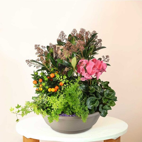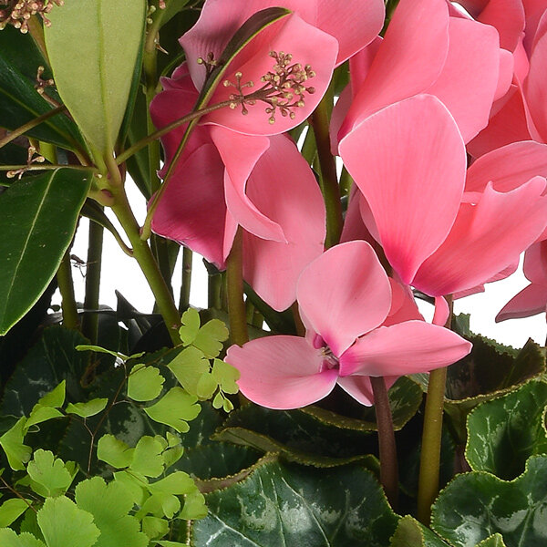 Coupe de plantes d'extérieur dans les tons de rose et vert, composé d'un skimia, d'un cyclamen, de solanum et de plantes vertes et fleuries dans un contenant rond en plastique (le contenant peut varier en fonction des disponibilités).