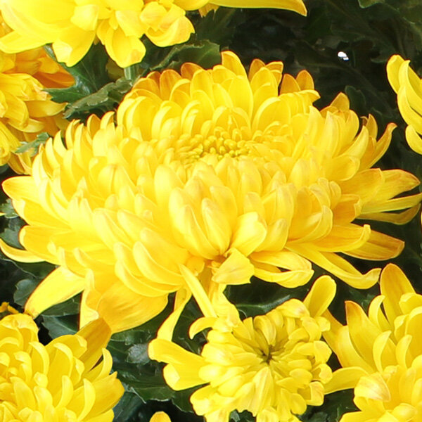 Potée de chrysanthèmes jaunes à gros pompons. Le contenant peut varier en fonction des disponibilités. Le nombre de pompons peut varier en fonction de la taille des fleurs disponibles chez le fleuriste en charge de votre commande.