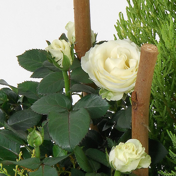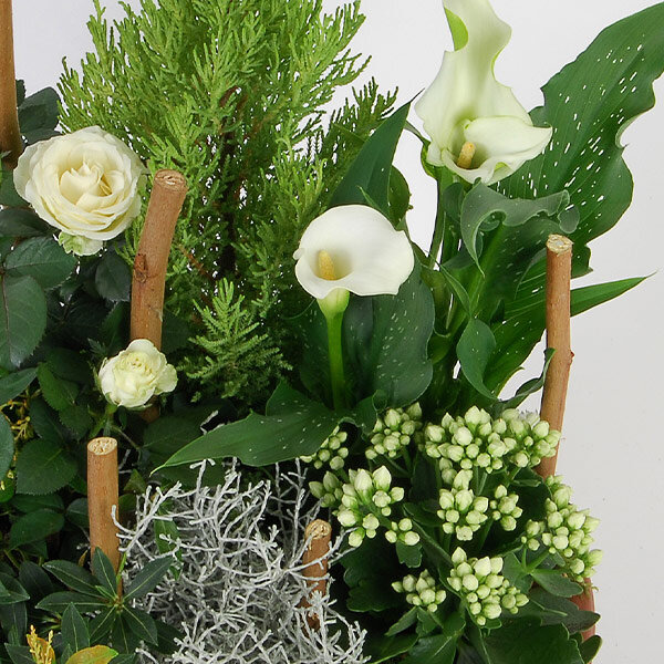 La composition Clairs Moments invite à un hommage simple et élégant avec sa coupe de plantes aux doux tons blanc et vert. Le rosier, accompagné de fleurs de saison, crée un ensemble apaisant, parfait pour fleurir une tombe avec délicatesse. Présentée dans une coupelle (le contenant pouvant varier selon le fleuriste), cette composition reste toujours harmonieuse et pleine de charme. Idéale pour une livraison sur tombe ou pour une cérémonie, elle apporte un souffle de sérénité et un témoignage de respect aux proches disparus.