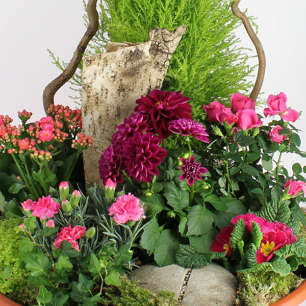 Composition de plantes d'extérieur et d'intérieur dans les tons de rose et vert composée d'un cyprès,dahlia et de plantes vertes et fleuries (le contenant peut varier en fonction des disponibilités et les plantes en fonction des saisons).