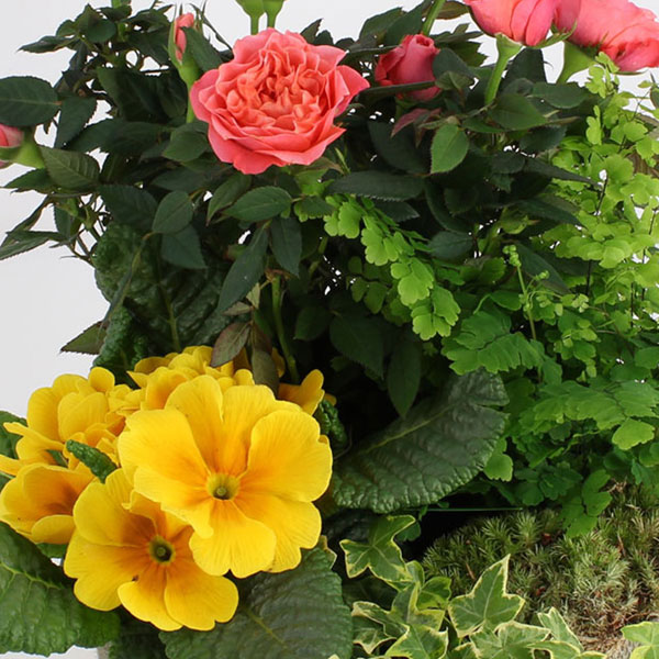 Composition de plantes d'intérieur et d'extérieur dans les tons de jaune, rose et vert composée d'un rosier, primevère et plantes vertes dans un contenant de forme ronde beige/marron (le contenant peut varier en fonction des disponibilités).