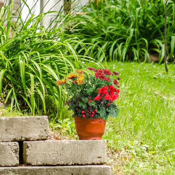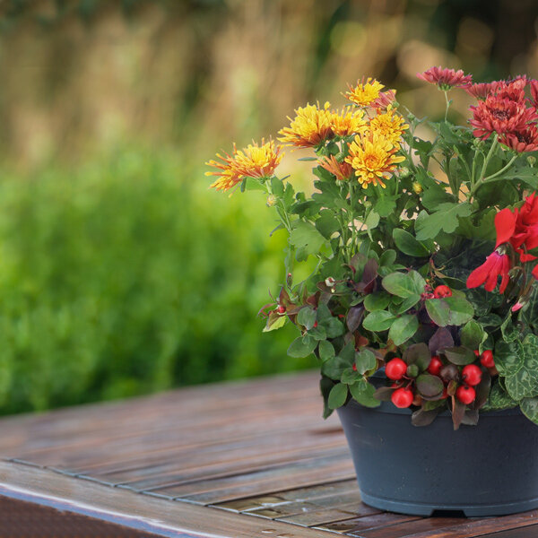 Composition de plantes d'extérieur dans les tons de rouge, jaune et vert composée de chrysanthèmes et de plantes fleuries dans une coupe ronde (le contenant peut varier en fonction des disponibilités et les plantes en fonction des saisons).