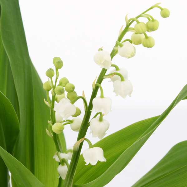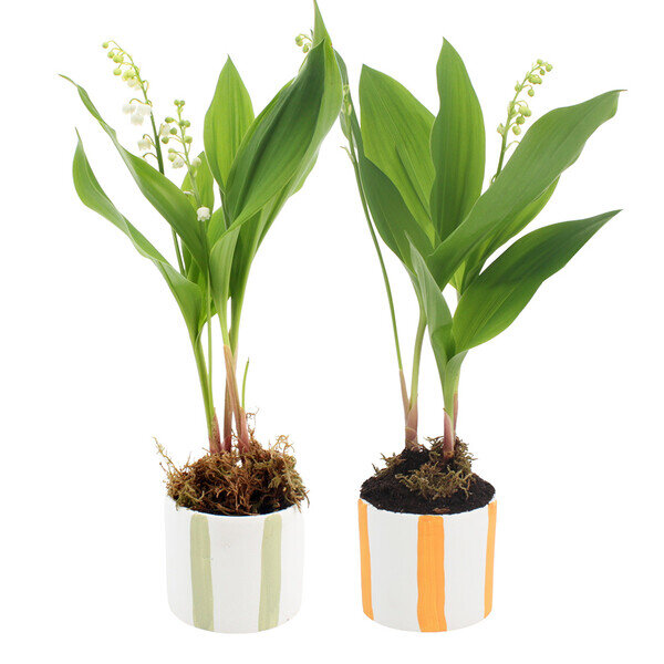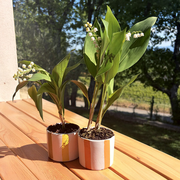 2 pots en céramique comprenant 2 brins de muguet chacun.