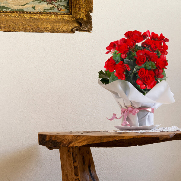 Bégonia rouge dans son pot. Le contenant peut varier en fonction des disponibilités du fleuriste en charge de votre commande.