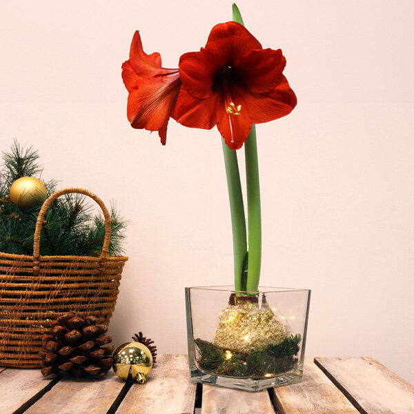 Pour parfaire votre décoration de fête, laissez-vous transporter par la beauté de notre amaryllis, fleur emblématique de la saison hivernale. Avec sa coque pailletée et son éclatante guirlande LED, cette création délicate, présentée sur un lit de sapin, ajoutera une touche magique à votre espace festif. L’occasion parfaite d’émerveiller vos invités lors des repas de fêtes de fin d’année.