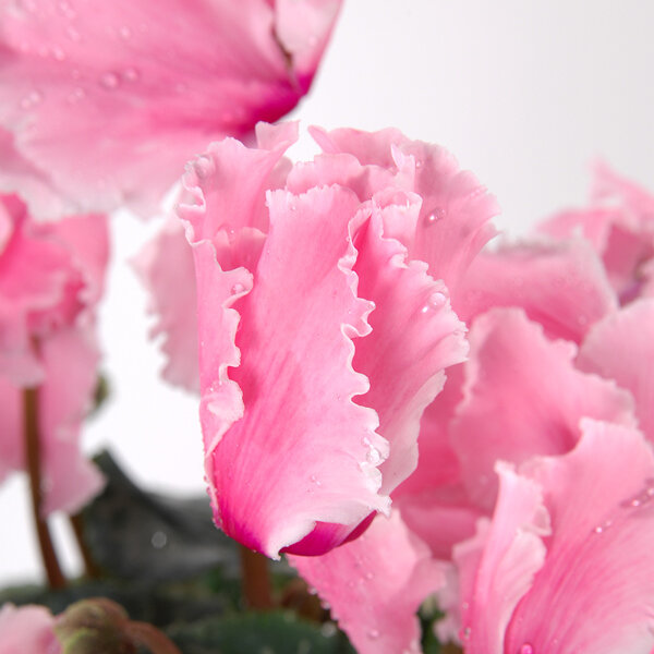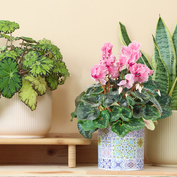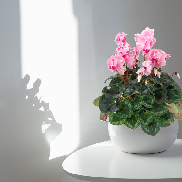 Cyclamen rose dans son pot. Le contenant peut varier en fonction de la disponibilité du fleuriste en charge de votre commande.