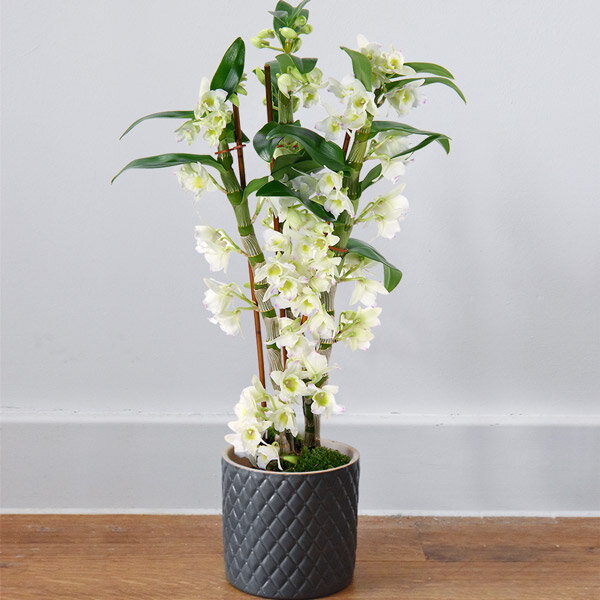 Le dendrobium ou orchidée bambou n'est décoratif qu'en hiver et en pleines fleurs. Votre précieux dendrobium a besoin de lumière et de températures assez hautes sans être desséchantes, un rebord de fenêtre lui conviendra en évitant le soleil brûlant de midi. Arrosez modérément de manière à ce que le mélange sèche bien en surface mais ne soit pas desséché à l'intérieur et respirez l'odeur enivrante de ses fleurettes.