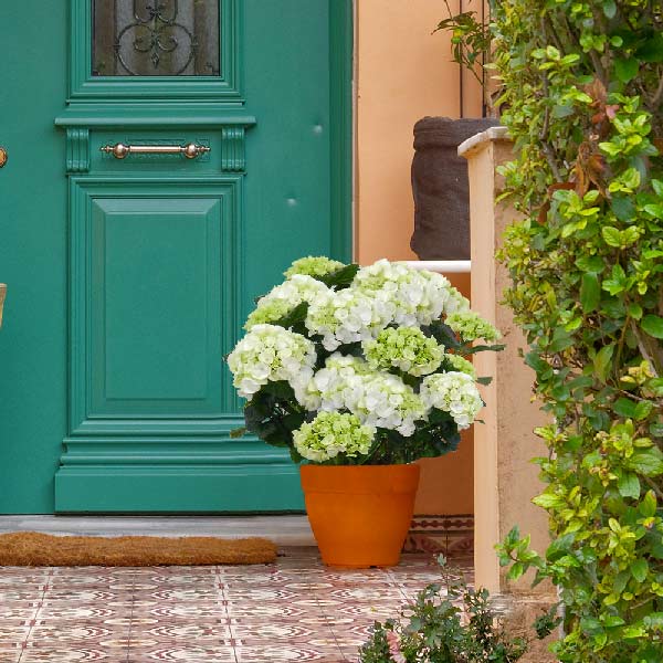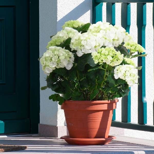 Hortensia hydrangea blanc (de préférence) en pot (hauteur 45 cm).