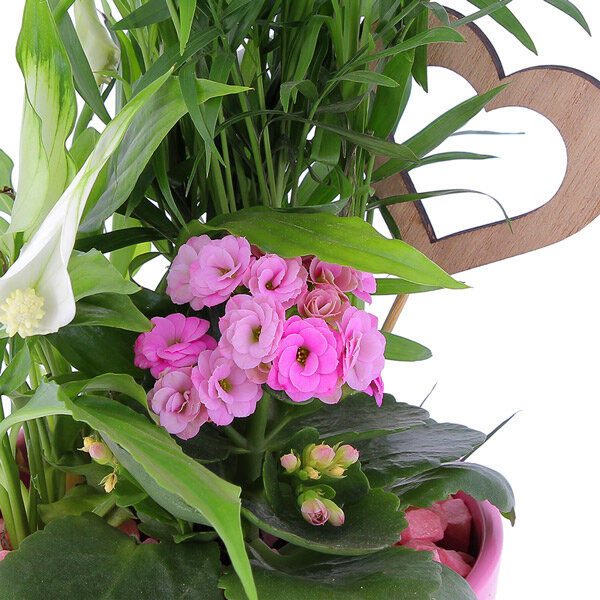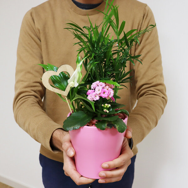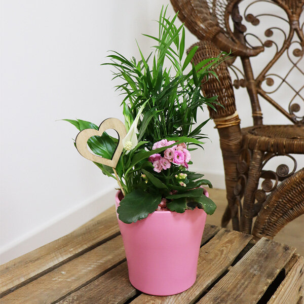 Tel un petit jardin en pot, la composition Olya viendra vous transporter dans les charmes intemporels d'une escapade bucolique. Avec ses nuances délicates de rose, de vert et de blanc, cette création évoque une atmosphère apaisante, où la plante verte, le kalanchoé et le spathyphillum s'entremêlent harmonieusement. Le tout est présenté dans un petit pot rose, agrémentée d'un pic en bois en forme de cœur pour une touche romantique et naturelle. Optez pour la livraison de fleurs fête des grands-mères et offrez Olya pour offrir une expérience fleurie pleine de charme à votre grand-mère bien-aimée.