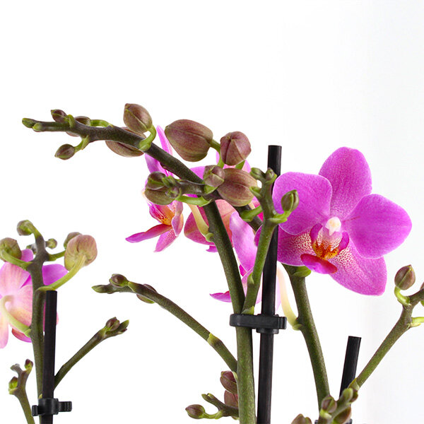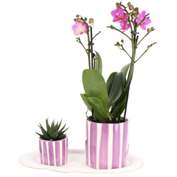 Découvrez ce joli duo végétal, composé d’une orchidée rose, symbole d’exotisme et de sensualité, qui s’accompagne d’une petite plante grasse au charme simple et rustique. Ensemble, elles créent un contraste harmonieux entre la finesse de l’orchidée et la robustesse de la succulente.