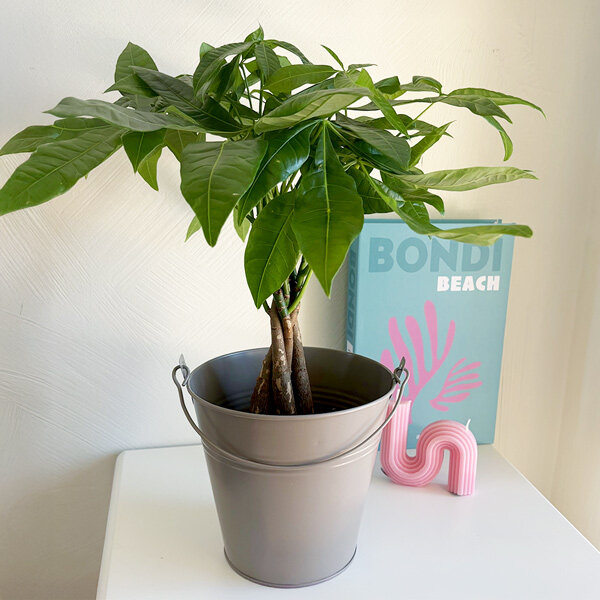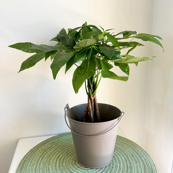 Le pachira ou cacaotier d’eau est un petit arbre qui s’adapte parfaitement à nos intérieurs. Selon la doctrine chinoise du Fen Shui ces feuilles ressemblant à des petites mains captent le bonheur et la fortune que son tronc torsadé conserve. Il nécessite peu d’entretien hormis une bonne luminosité mais sans soleil direct et un arrosage modéré. Dans son cache-pot blanc, cette plante est des plus décoratives. Elle est le cadeau parfait pour une pendaison de crémaillère ou un anniversaire.