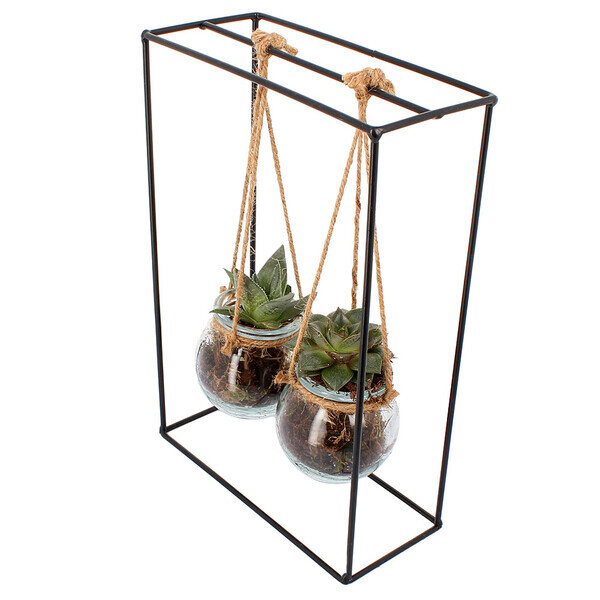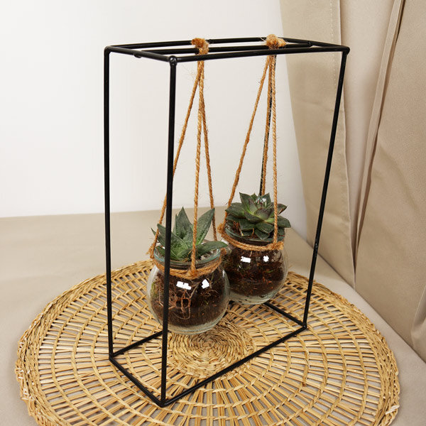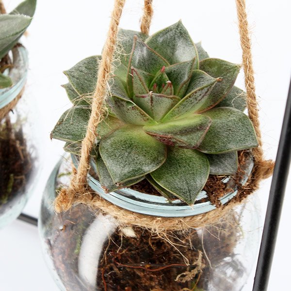 Deux petites plantes grasses, dans leur pot en verre transparent, suspendues à une structure métallique noire.