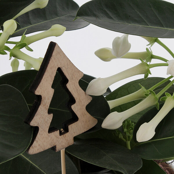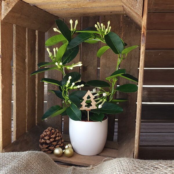 Notre Stephanotis se met dans l'ambiance festive de la saison en s'accompagnant d'un pic en forme de sapin. Les jolies fleurs blanches dansent avec entrain autour de ce nouvel accessoire, créant ainsi une scène pleine de joie. Avec son look festif, le pic sapin donne une touche déco à notre jolie plante, la transformant en une véritable star de l'hiver. Ainsi, notre Stephanotis se réinvente avec élégance, créant une atmosphère enchantée au sein du cocon douillet où il sera disposé.