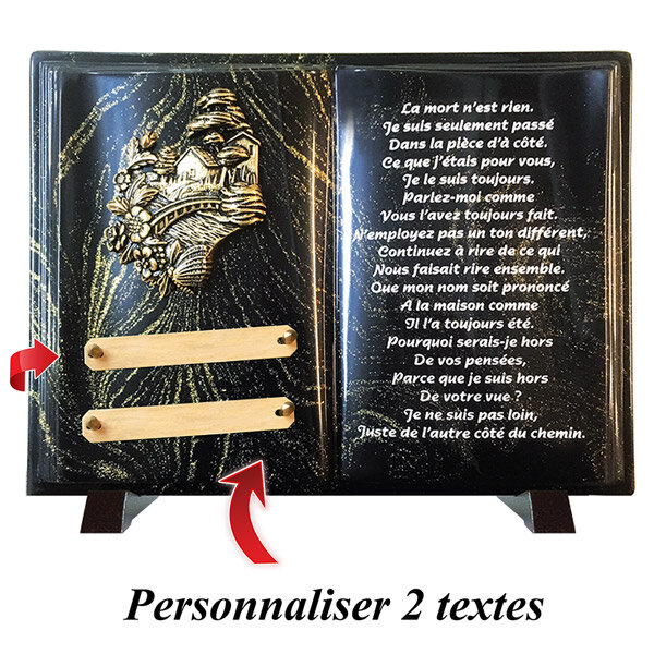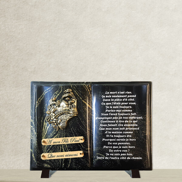 Chaque plaque funéraire Florajet est réalisée avec soin par notre partenaire et conçue dans des matériaux durables et nobles : poudre de granit ou composite pour la base, ornements en bronze pour les motifs décoratifs, pieds en aluminium pour une stabilité optimale. Chaque gravure et finition est contrôlée pour garantir précision, élégance et respect de votre message personnalisé. La plaque est livrée entièrement montée, prête à être installée. Elle est ensuite expédiée par transporteur dans des conditions sécurisées pour vous parvenir en parfait état. Un hommage durable et respectueux, conçu pour honorer dignement la mémoire d'un être cher.