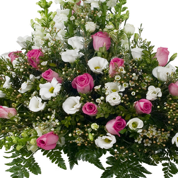 Raquette rose et blanche composée de roses roses, lisianthus, muflier et autres fleurs.