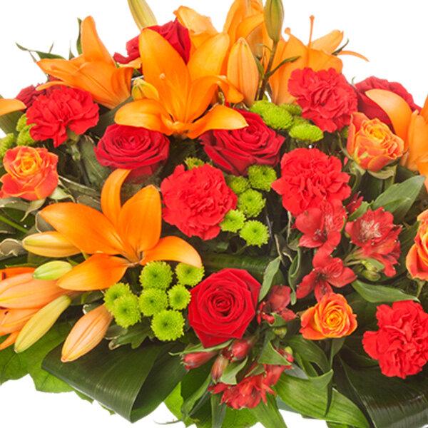 Raquette de deuil dans les tons orange, vert et rouge composée de roses orange, lys orange, santinis verts, roses rouges, œillets rouges, alstromérias rouges, salal, aspidistra et pittosporum.